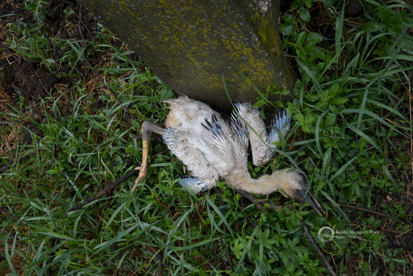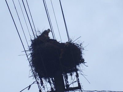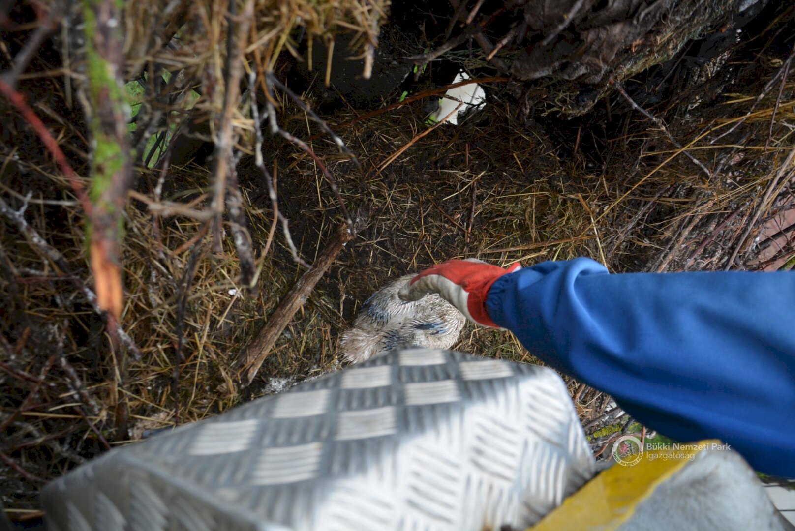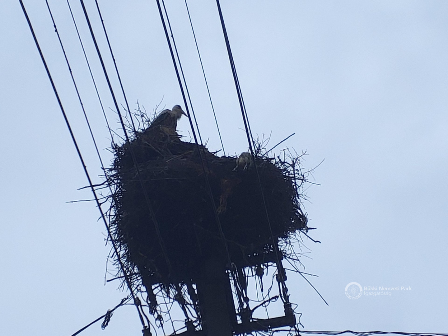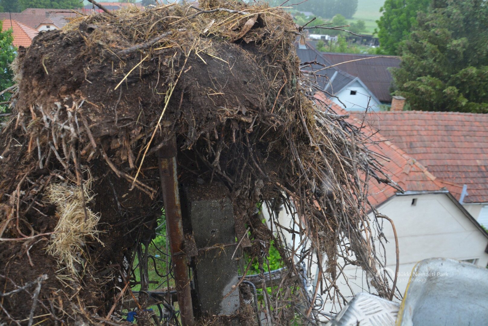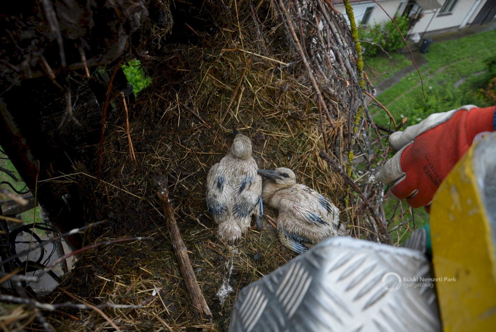 Sajnos a négyből az egyik fióka kiesett, egy másik pedig a fészekanyagban, illetve a vezetékekben akadt fenn, így mindketten elpusztultak. Viszont a két kisebb fészektestvérük benne maradt a megdőlt fészekcsészében. Néha kisebbnek lenni is lehet előny... A riasztás után a Nógrádi tájegység felvette a kapcsolatot az MVM-ÉMÁSZ-szal és egy emelőkosaras gépjármű formájában meg is érkezett a segítség. Az áramtalanítás után először a fiókákat helyeztük biztonságba, majd a fészekanyag leszakadt részeit távolítottuk el. Ezután a fészektartón lévő megmaradt fészekanyag mennyiségét csökkentettük az optimális szintre, és egy új fészekcsészét alakítottunk ki benne, ahová visszahelyeztük a két életben maradt fiókát. Az öreg madarak végig figyelték a mentési, helyreállítási mozzanatokat, majd ők maguk is hordani kezdték a fészekanyagot.