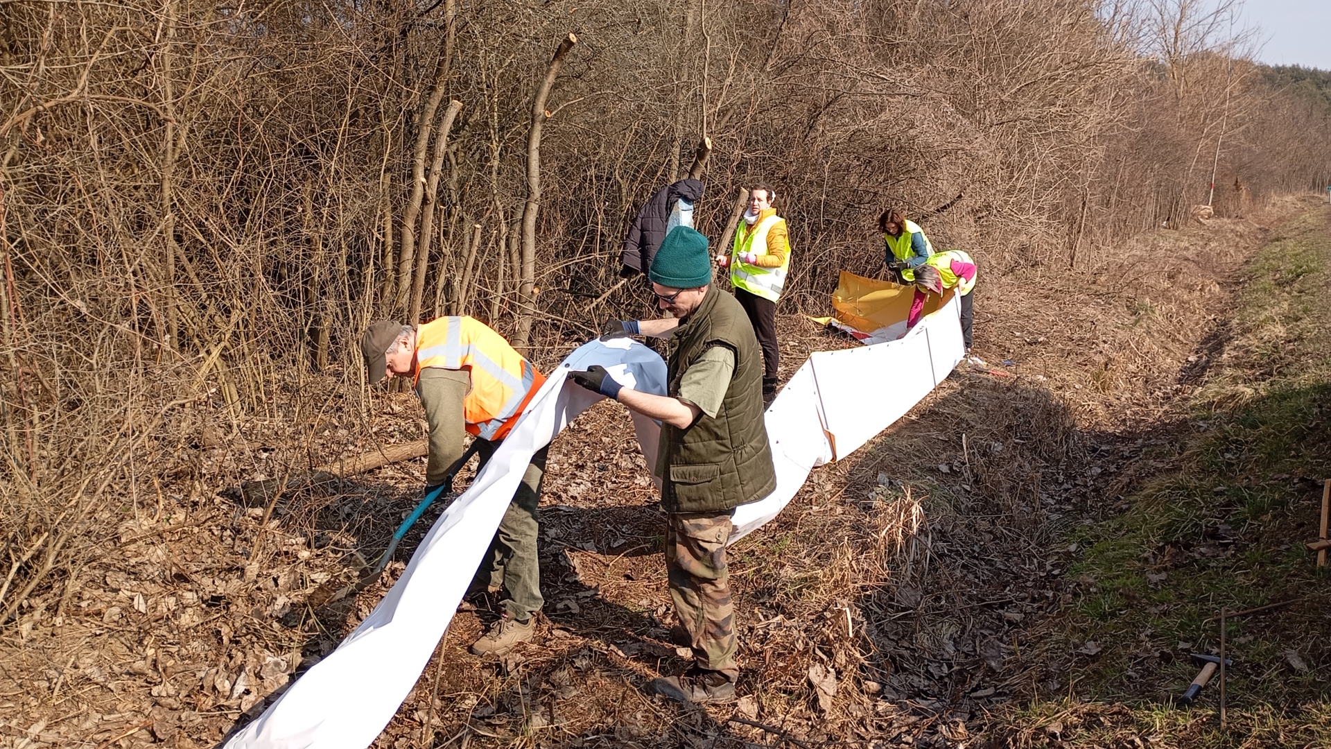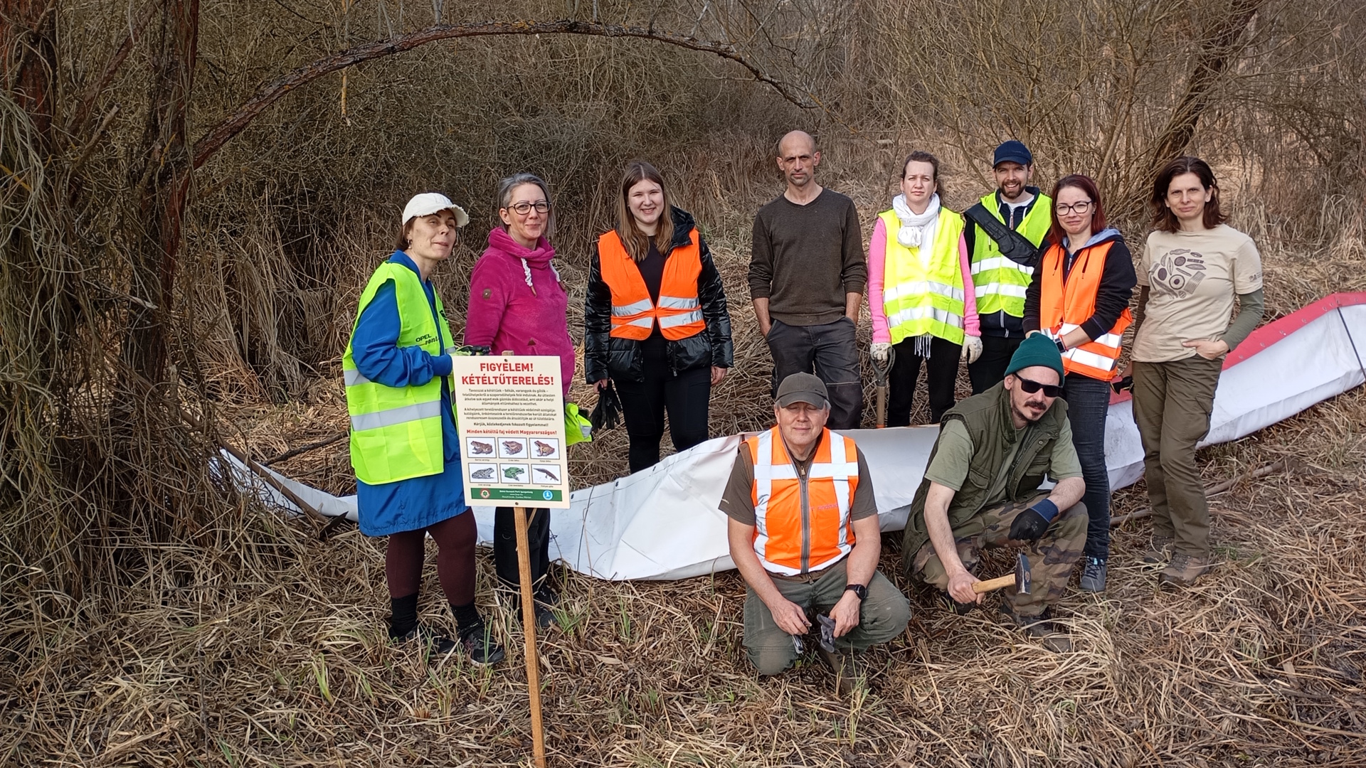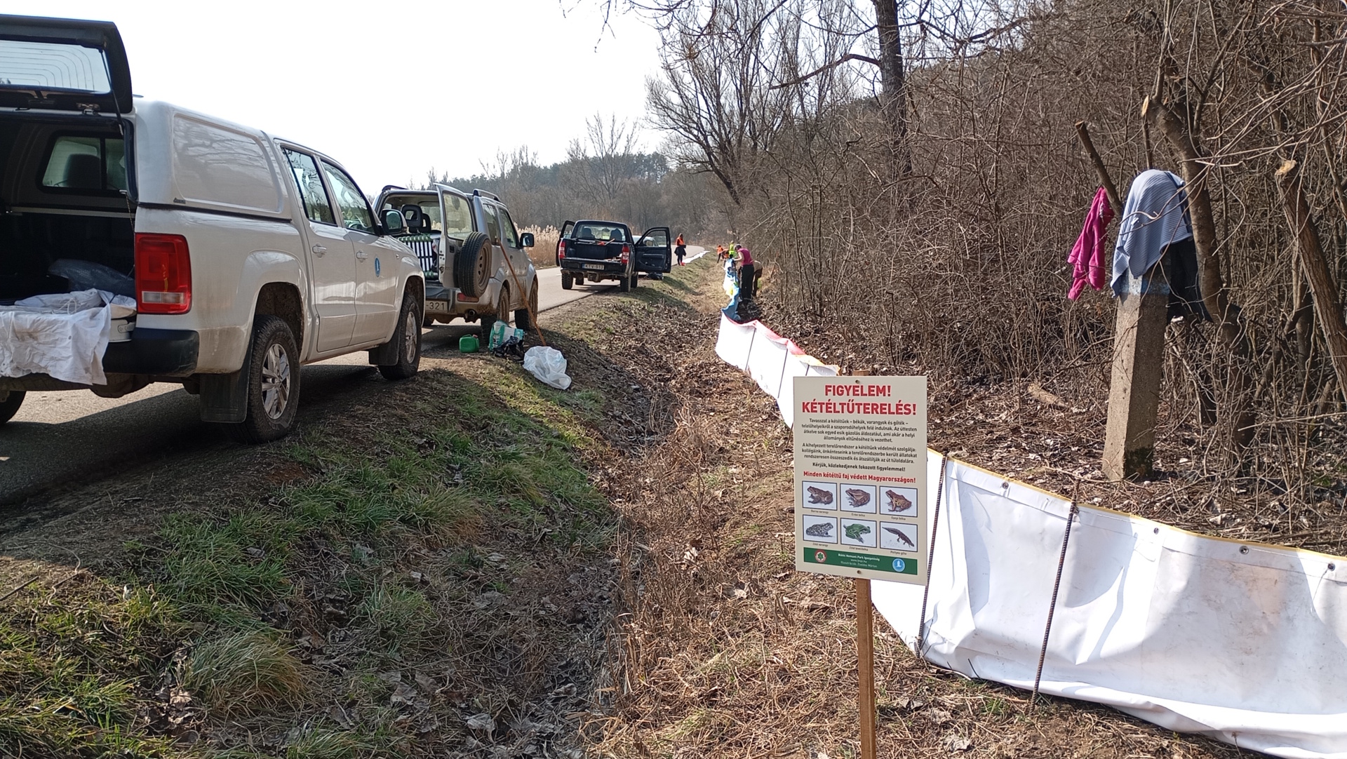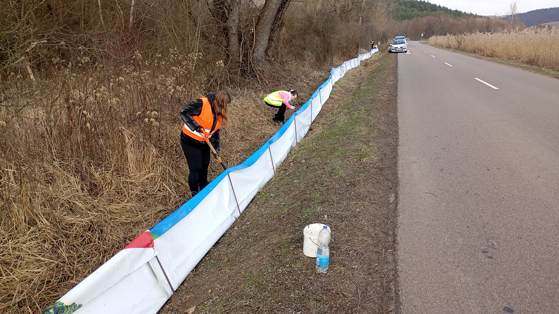Ezt megelőzendő, március 5-én felkerekedtünk önkénteseinkkel és felépítettünk egy 150 méter hosszú terelőrendszert. A kétéltű terelő azt a célt szolgálja, hogy a telelőhelyekről érkező kétéltűeket megállítsa az út mentén, így azok nem tudnak átkelni. A terelőfal mögött rekedt békákat és gőtéket Természetvédelmi Őrszolgálatunk, valamint önkénteseink gyűjtik össze napról napra, a vonulás csúcsidőszakában akár naponta többször is, és vödrökben szállítják át az úton a szaporodóhelyre, így megelőzve a gázolásokat.
